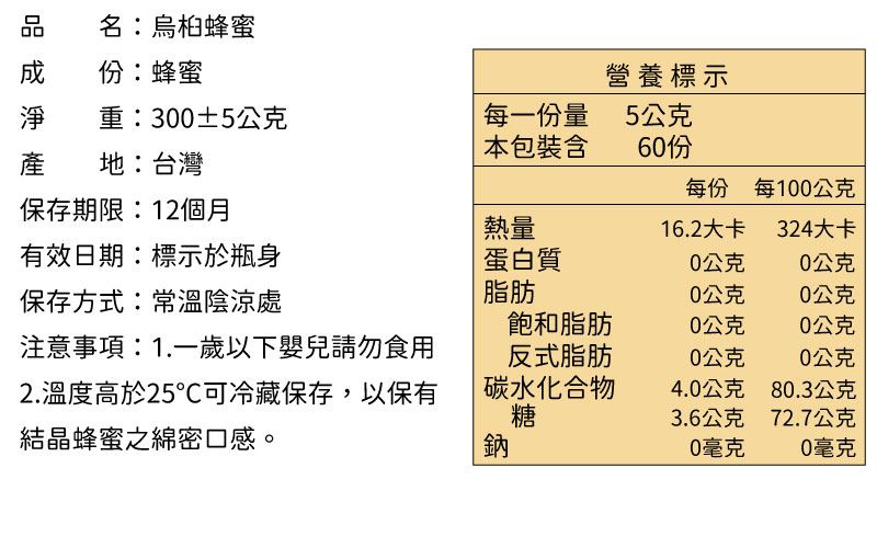 2.溫度高於25°C可冷藏保存,以保有結晶蜂蜜之綿密口感。