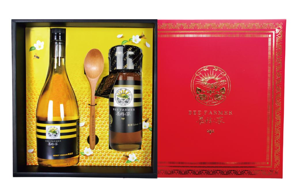 禮盒內容物:優選Taiwan龍眼蜂蜜425gx1瓶+純釀蜂蜜醋系列600mlx1瓶+原木湯匙x1支